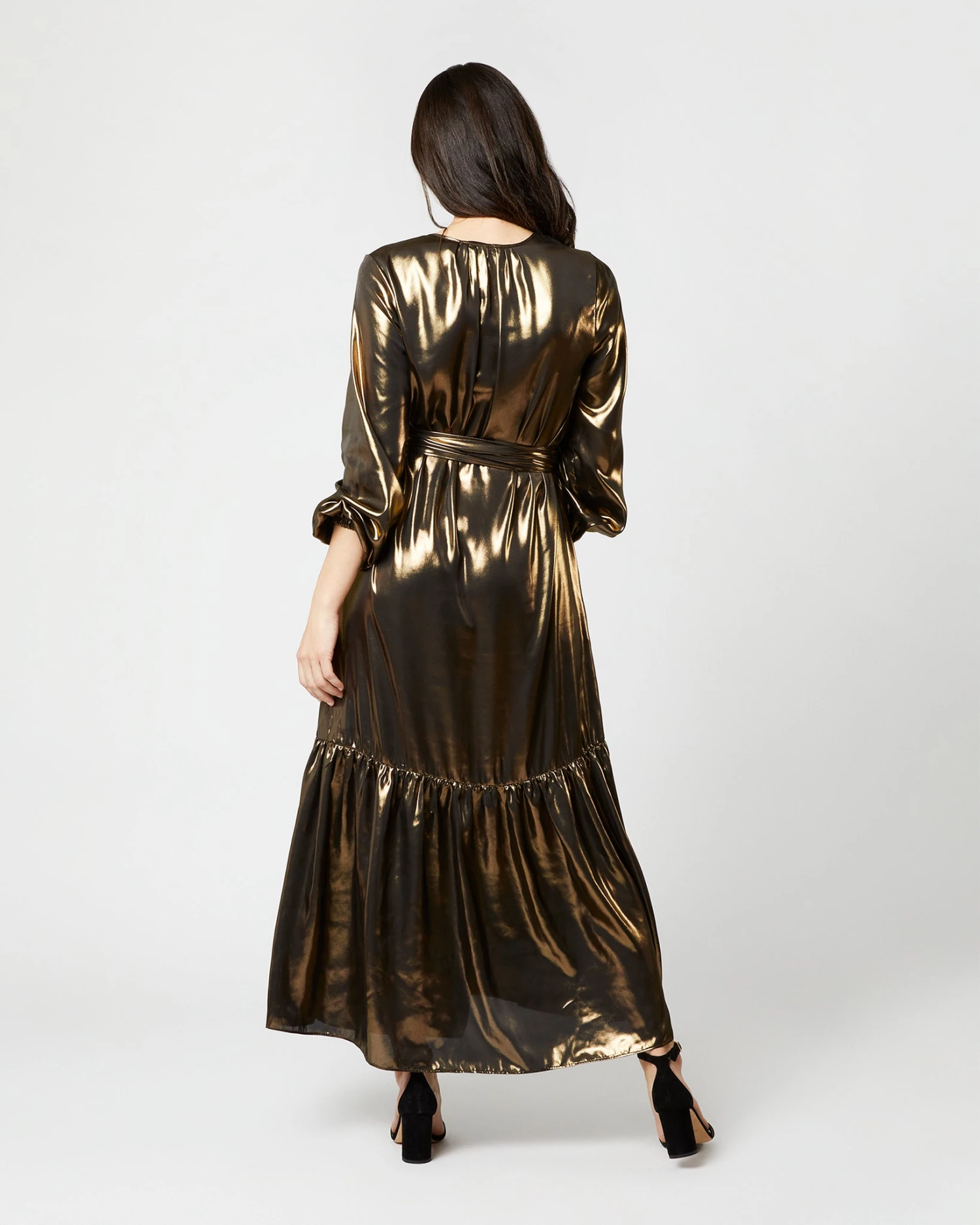 The Aba is a super easy party silhouette to dress up or down or somewhere in between. (Proof: Ann claims she’s worn it to three or four weddings herself.) There’s a hook-and-eye closure at the top of the neck, which can give it a slightly different look when you wear it closed vs. open, plus elasticated cuffs and a chic, optional self-tie belt. This one is made up in a very beautiful, very special lamé — created with a heat-transfer process that gives the fabric a fantastic texture. All of the shimmer, none of the scratchiness.