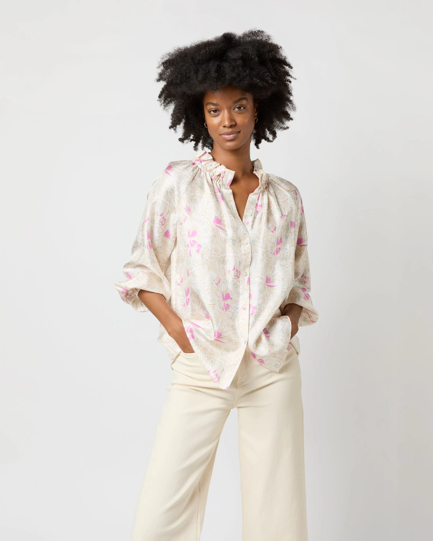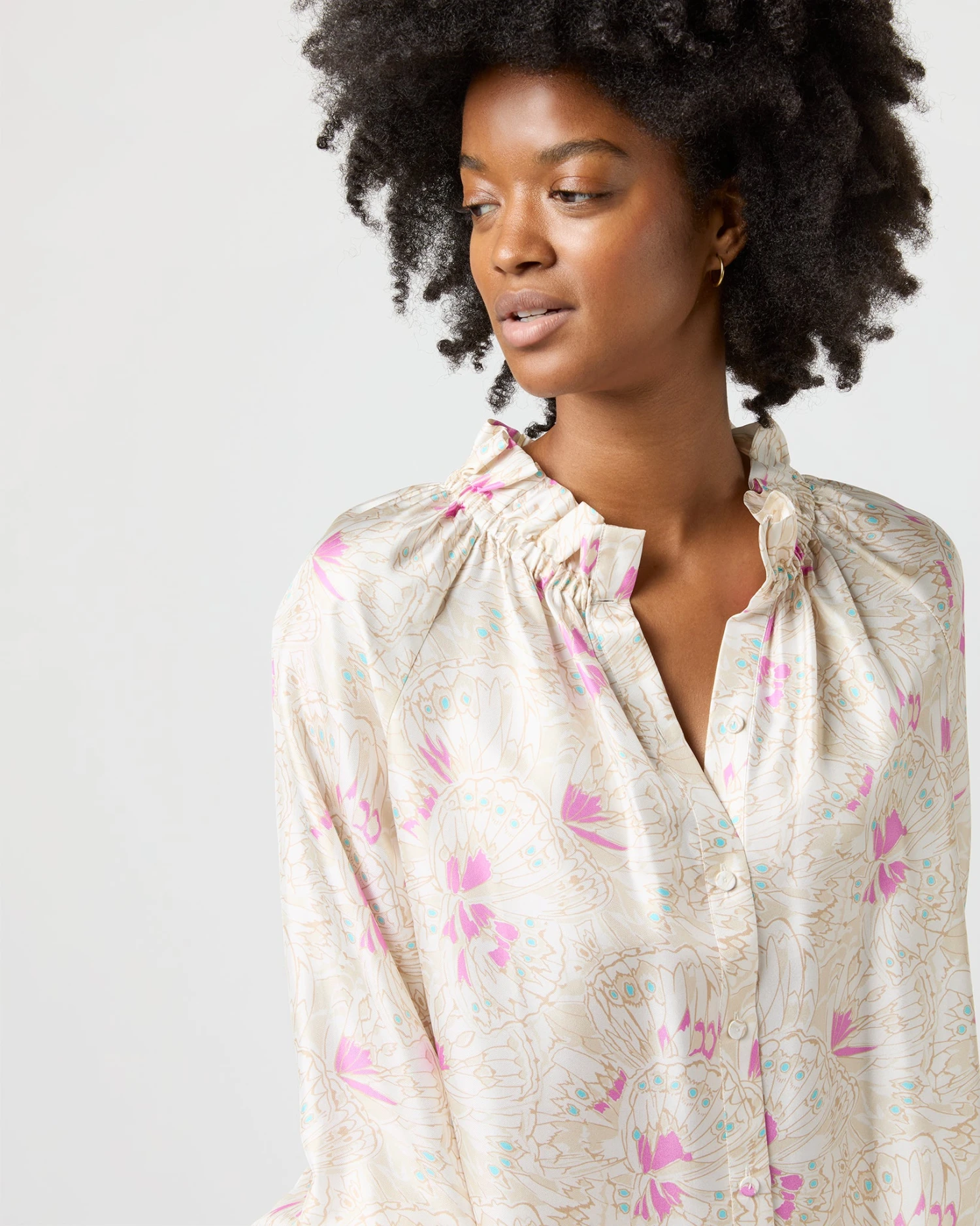 Button-Front Kamille Blouse In Khaki/Pink Butterflies Silk Twill