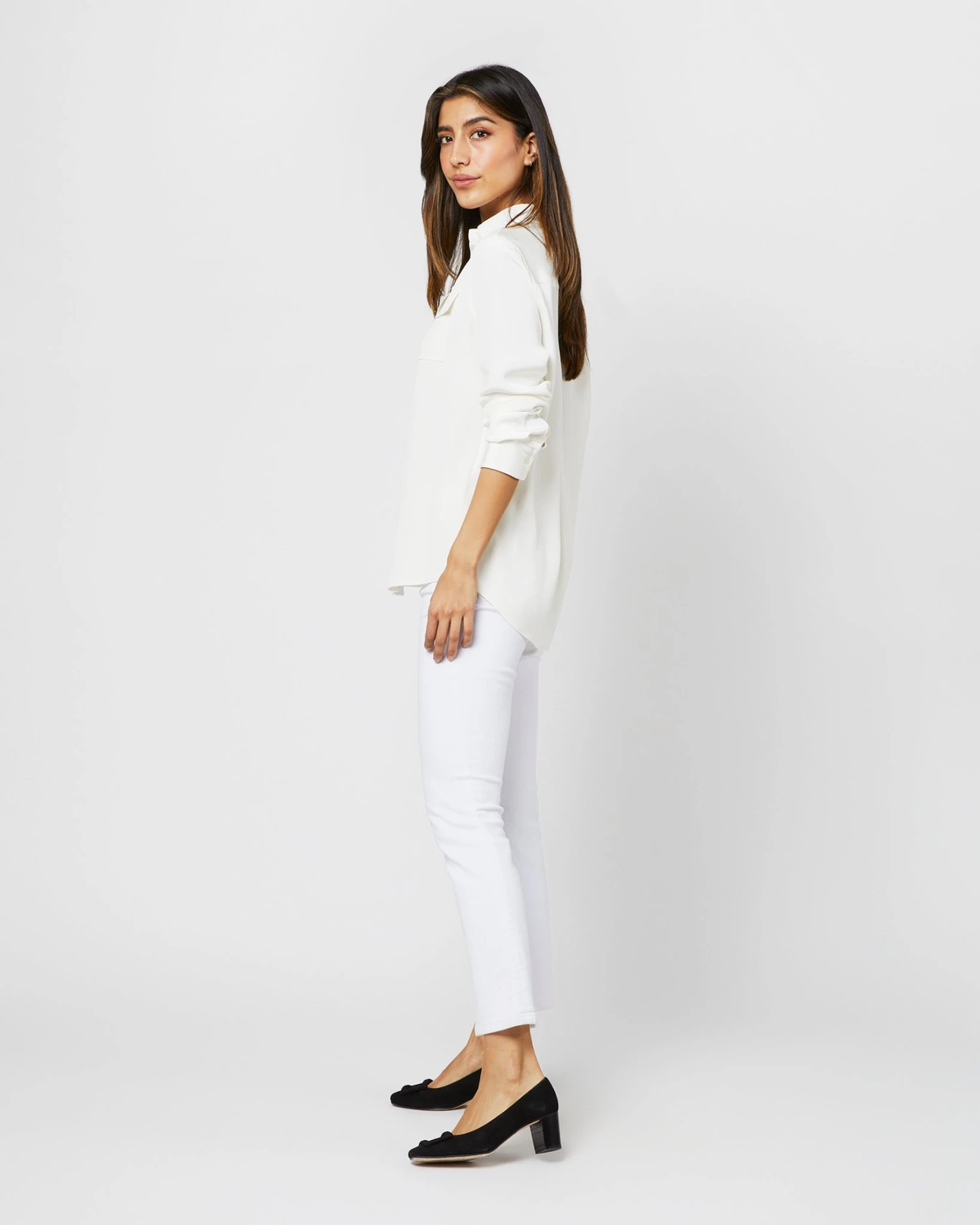 The Hannah is a slightly more utilitarian add to our silk program. The flap pockets and easy fit through the body give it a more tomboy feel than the feminine tie necklines and puffed sleeves of our other shapes, but no less special (and made of the same luxe, 4ply silk crepe de chine with mother of pearl buttons.)