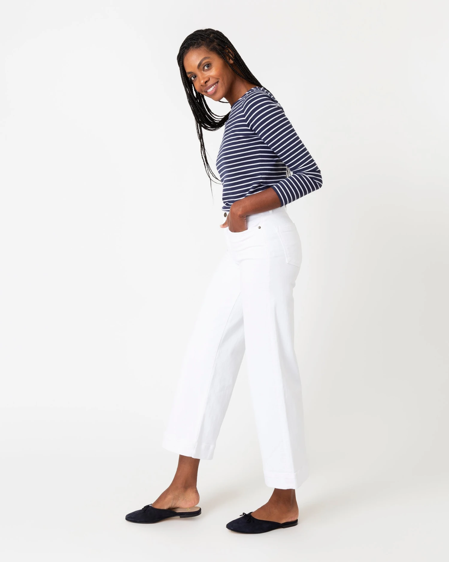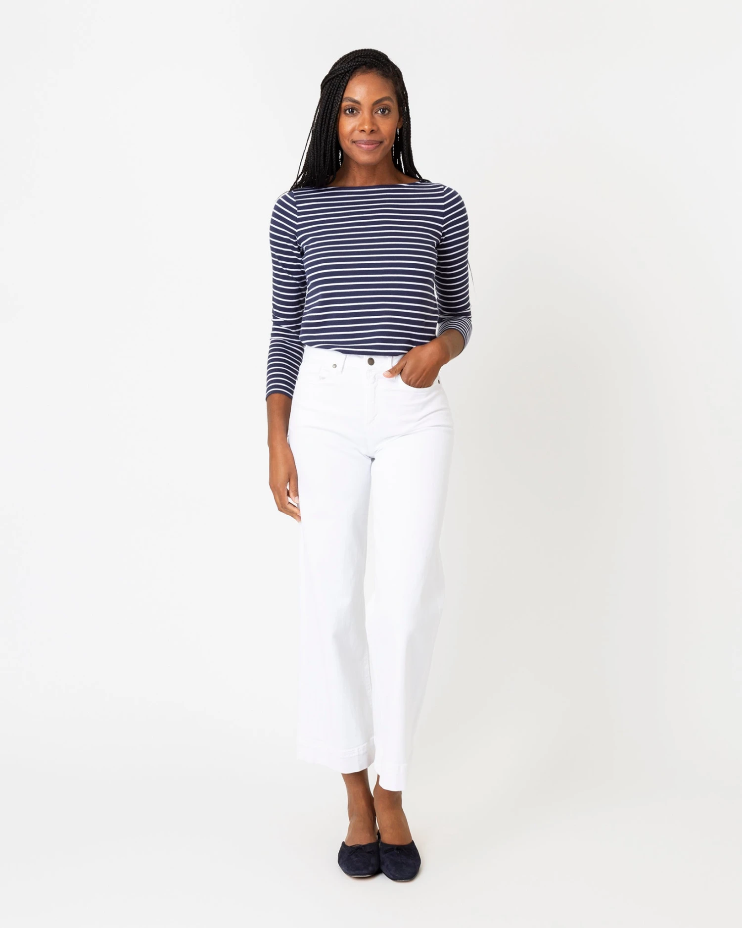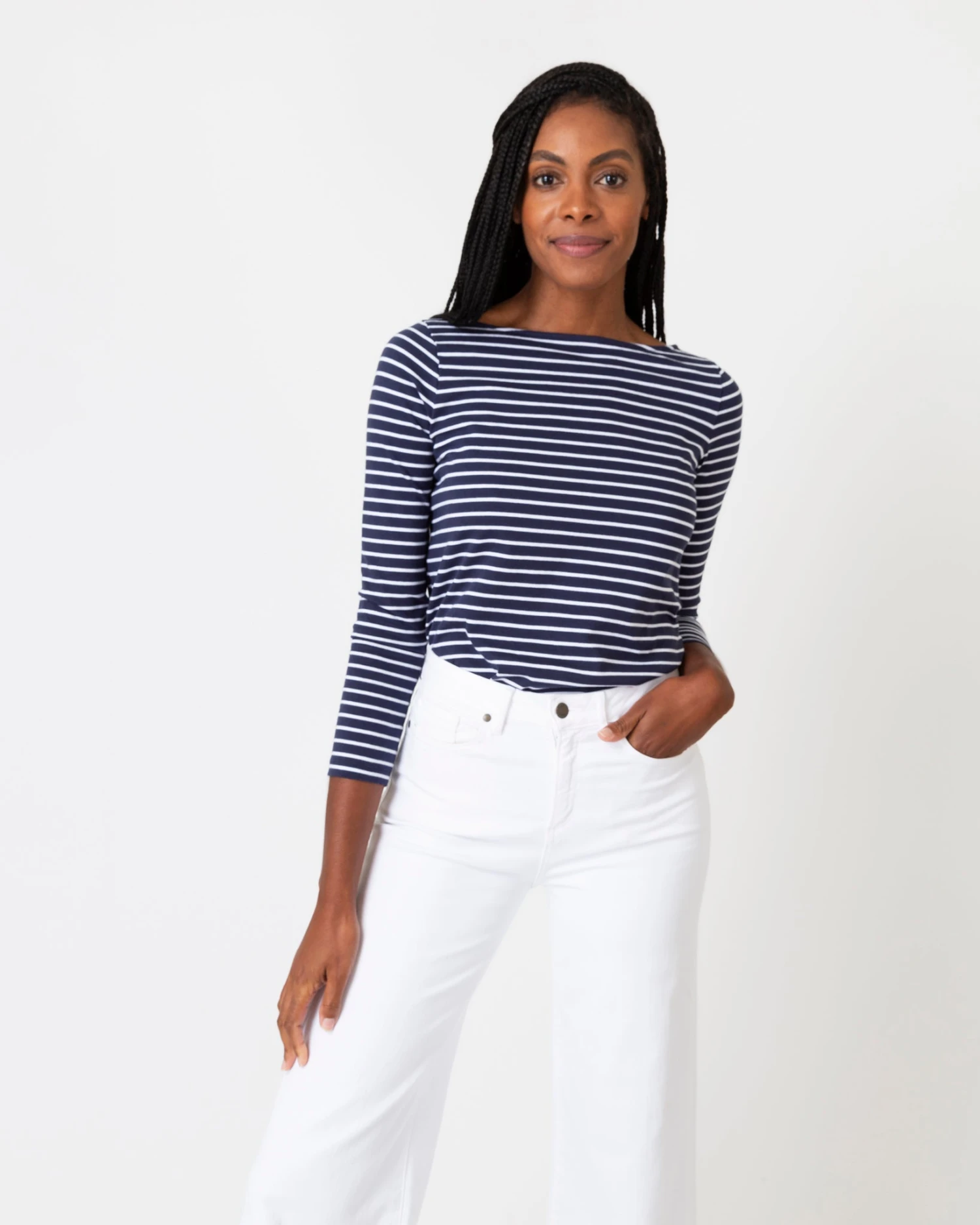 Our striped boatneck tee is a real closet MVP. It’s refined enough to dress up with a blazer, but also trim enough to layer under an oversized button-down. You could also take it nautical with wide-leg jeans and espadrilles… or tuck it into an A-line skirt for more of a 1960s-French-actress thing. Lots of possibilities. It’s made of cotton jersey that comes from a French heritage mill famous for its stripes.
