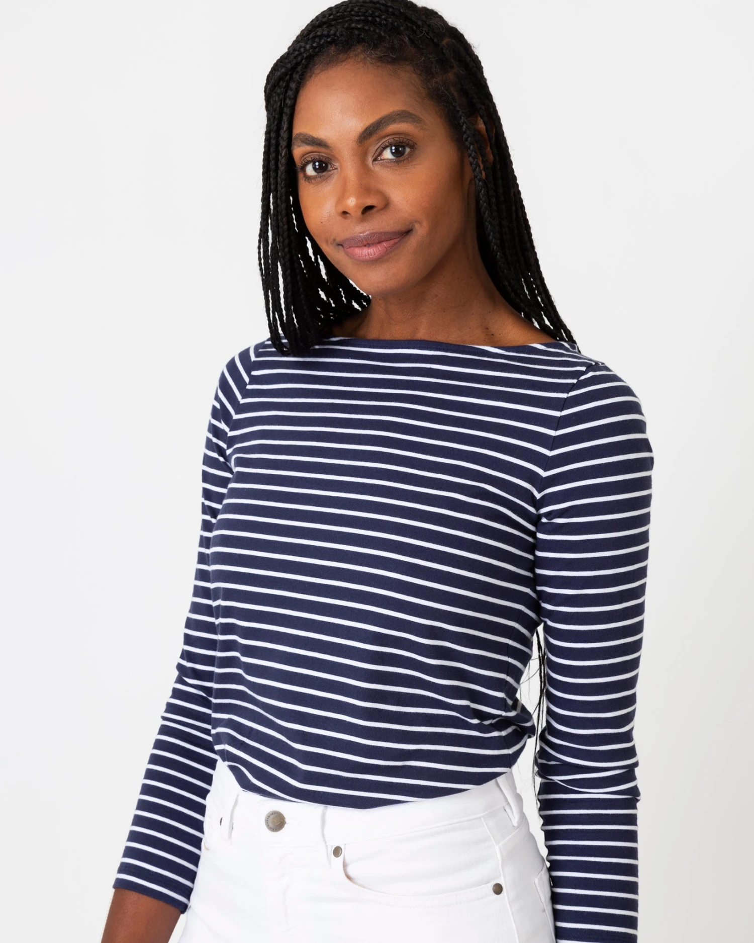 Be the first to review “Long-Sleeved Boatneck Tee In Navy/White Stripe Jersey” Cancel reply