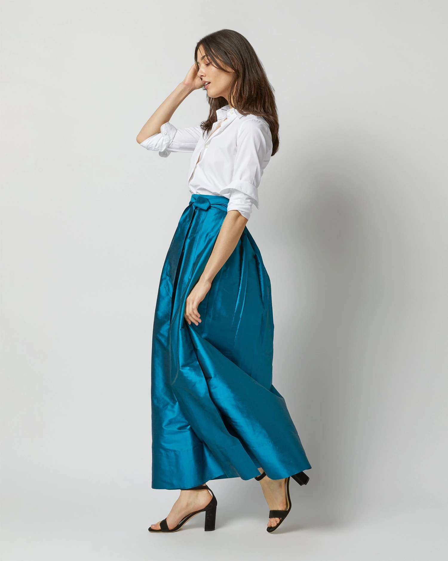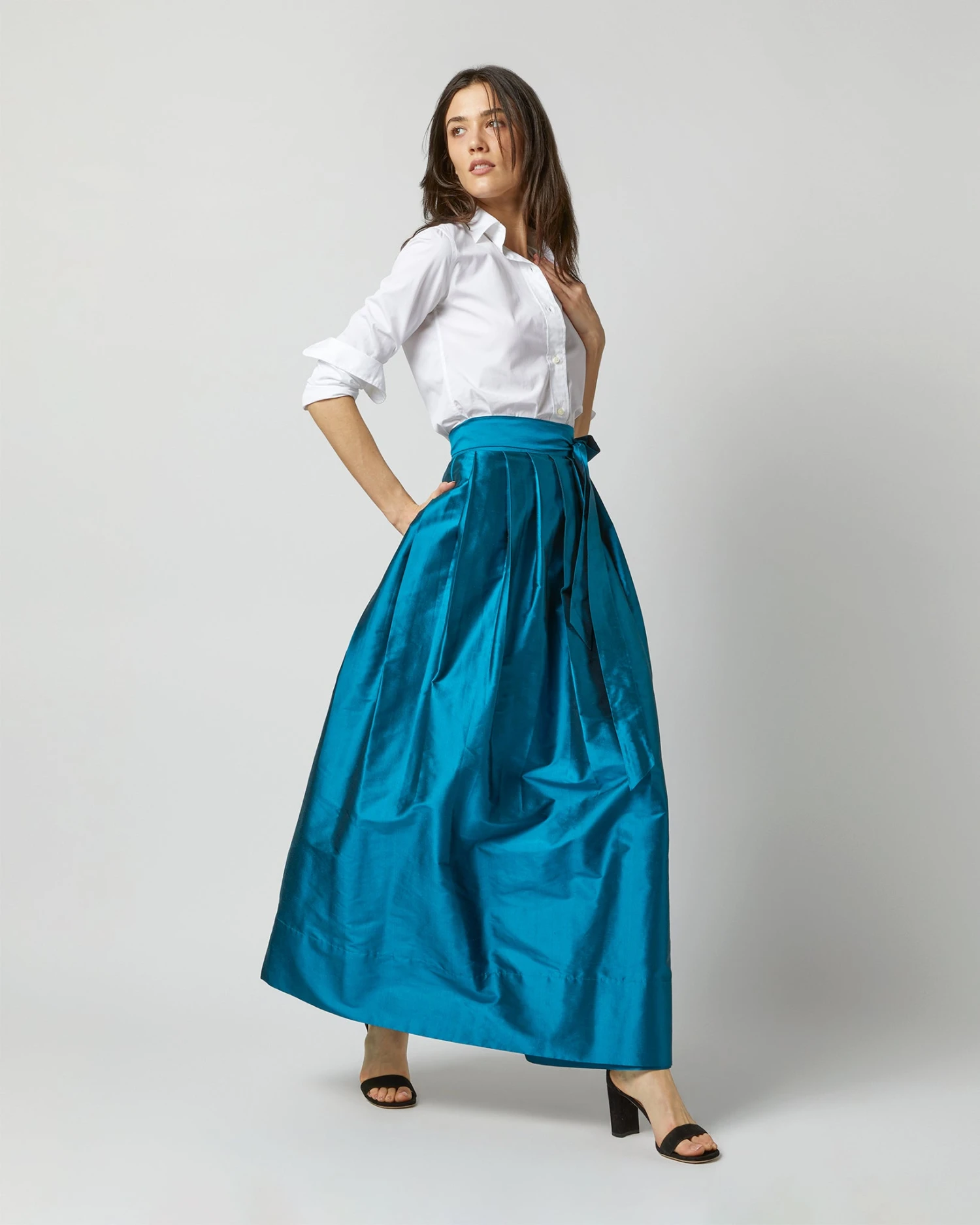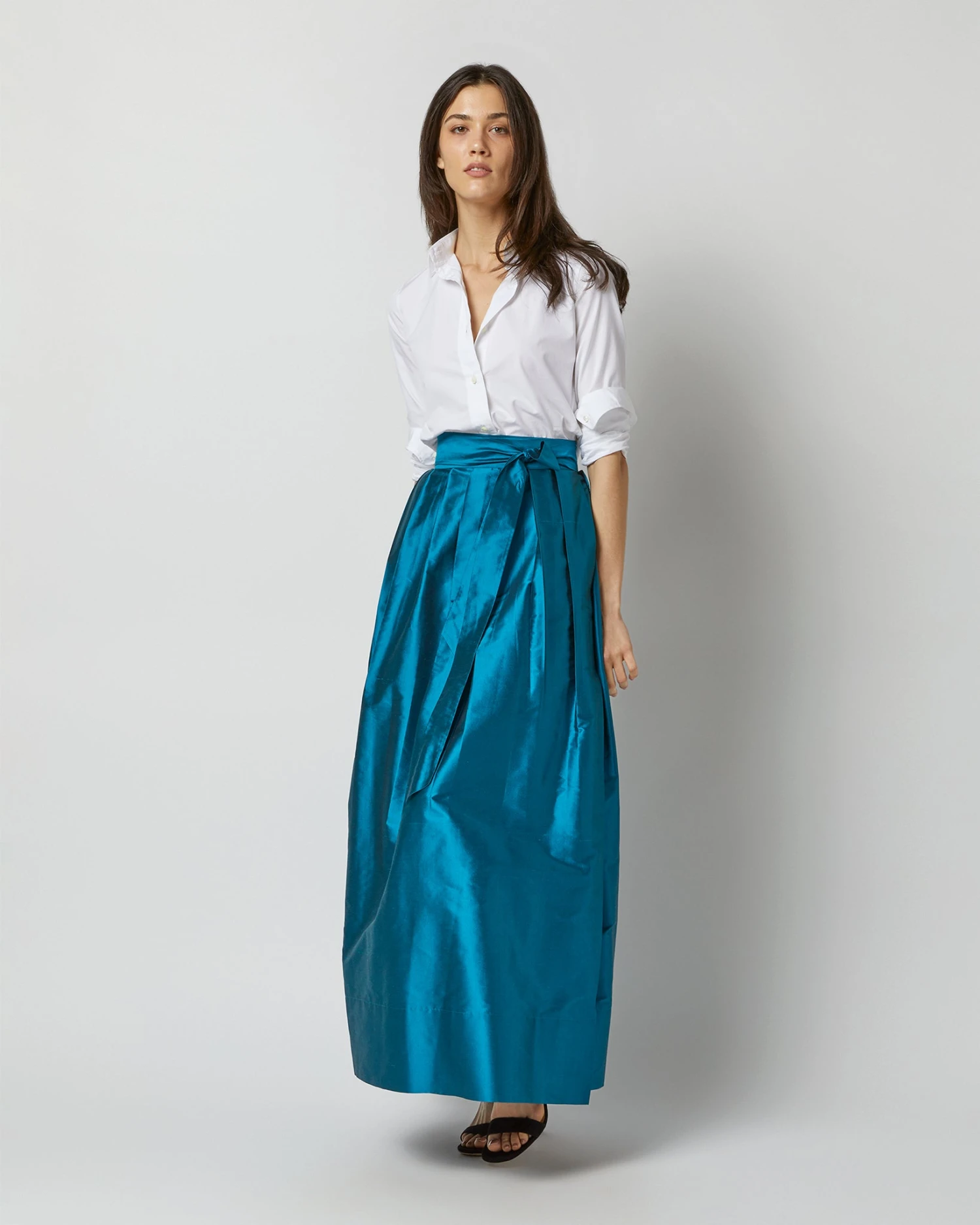 A chic, party-ready wrap skirt made of lightweight, subtly shimmery silk shantung. (Try saying that five times fast.) That said, it also looks pretty great dressed down for daytime. It’s got an adjustable waist tie that gives you a fantastic, cinched-in shape… we recommend a girly bow, or a big karate-belt knot with the ends hanging loose. It sits high on the waist with a full skirt that gives you plenty of room to move. There’s even a matching shirt if you want to make it a full look.