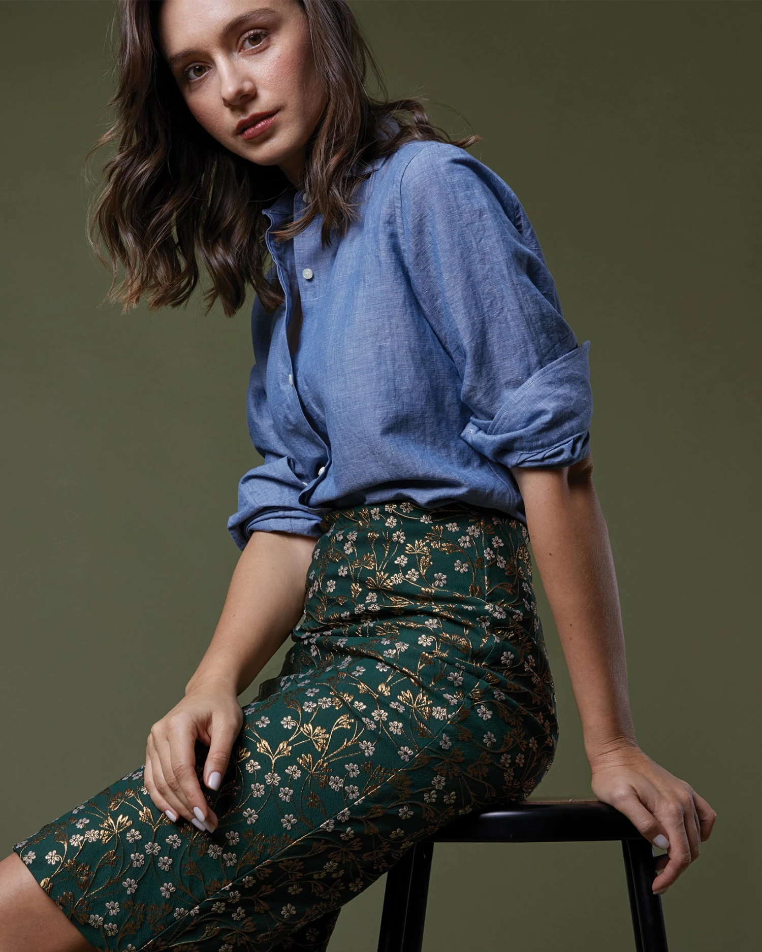 A just-pull-it-on pencil skirt in a chic, subtly shimmery French jacquard. Ann called it “a fashion editor’s skirt” — high praise! Instantly elevates your favorite turtleneck, a silk tee, or a crisp white shirt.