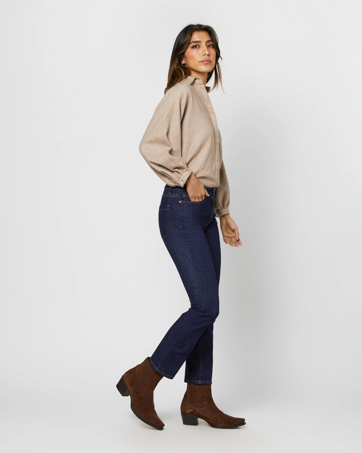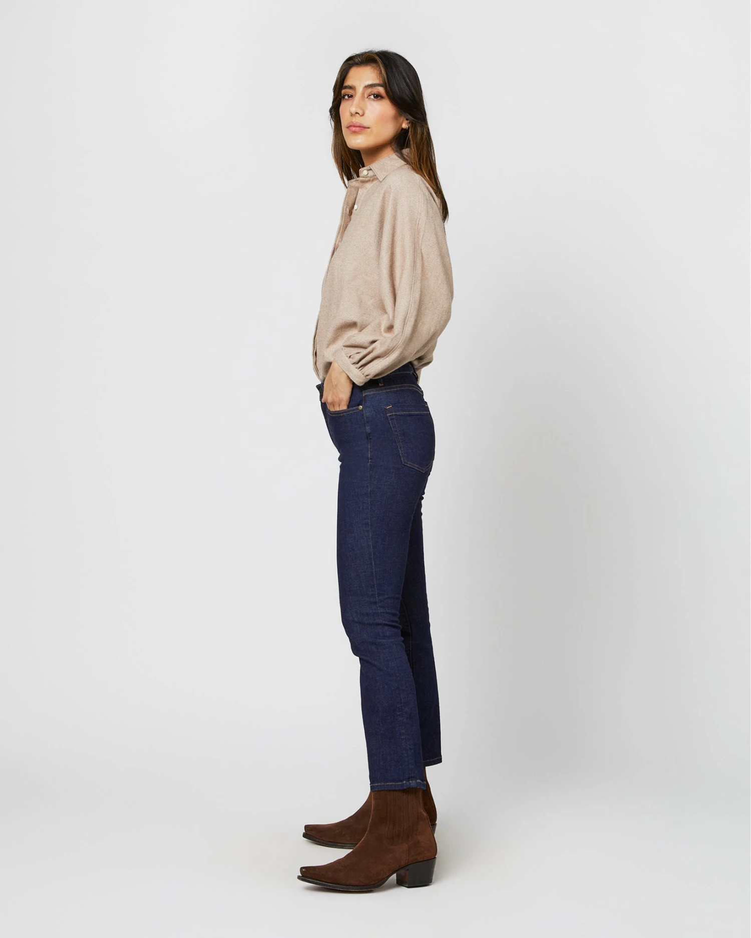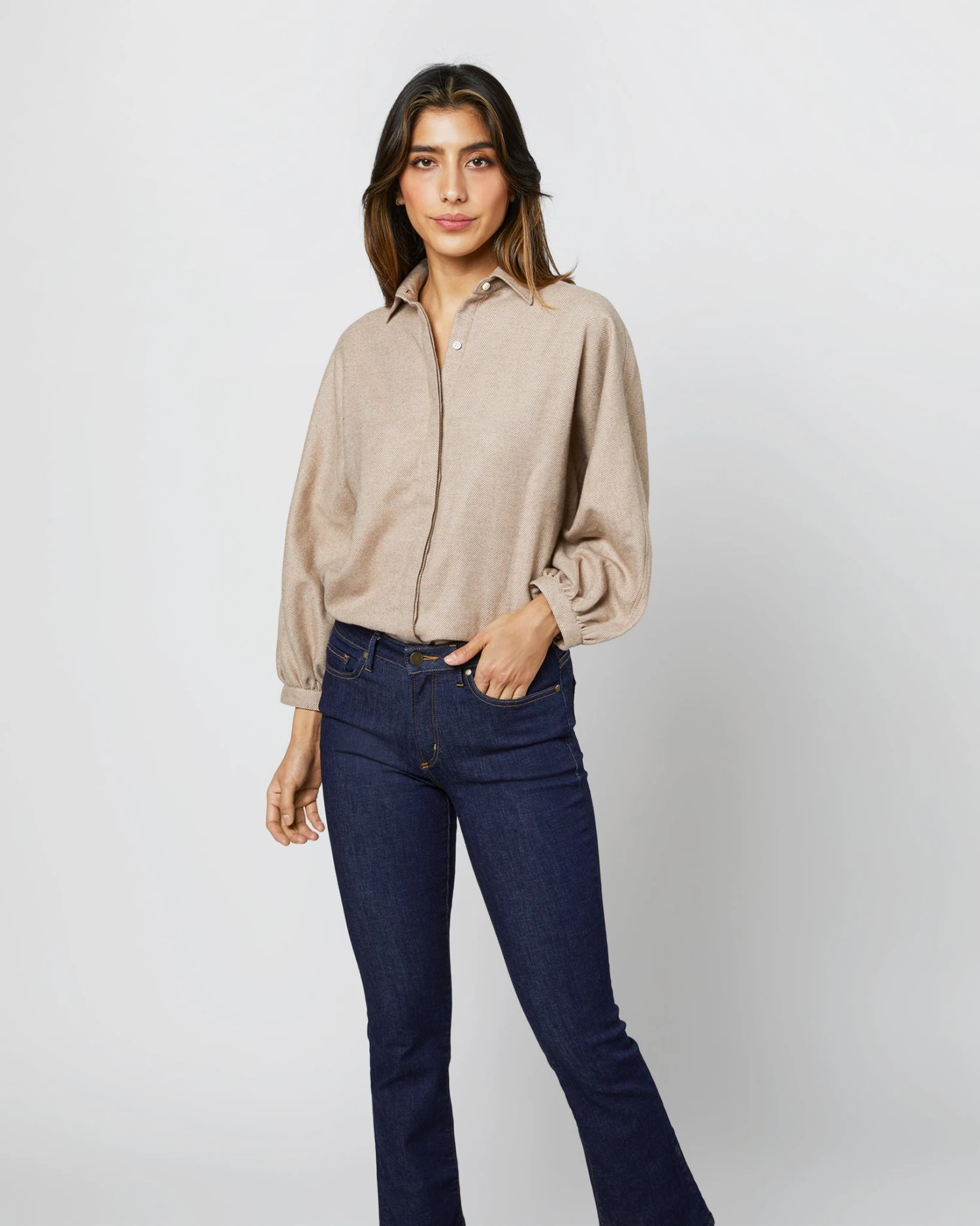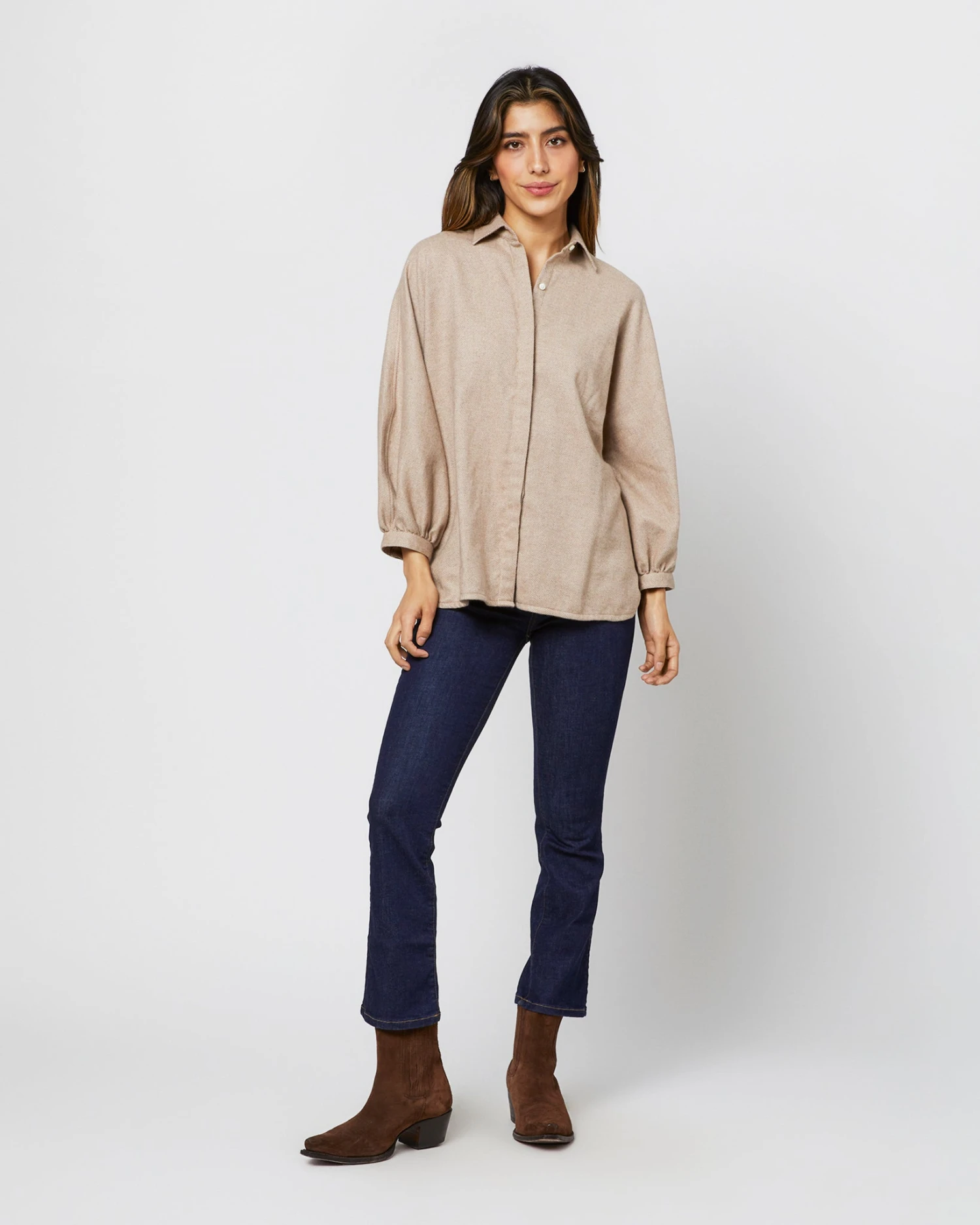 An incredibly cozy riff on one of our favorite shirt shapes. This one is made up in a brushed herringbone from Italy that’s as soft as it sounds. It’s got a point collar, a covered front placket, puffed bracelet-length sleeves, slits at the side, and the shape is easy through the body, but still polished.